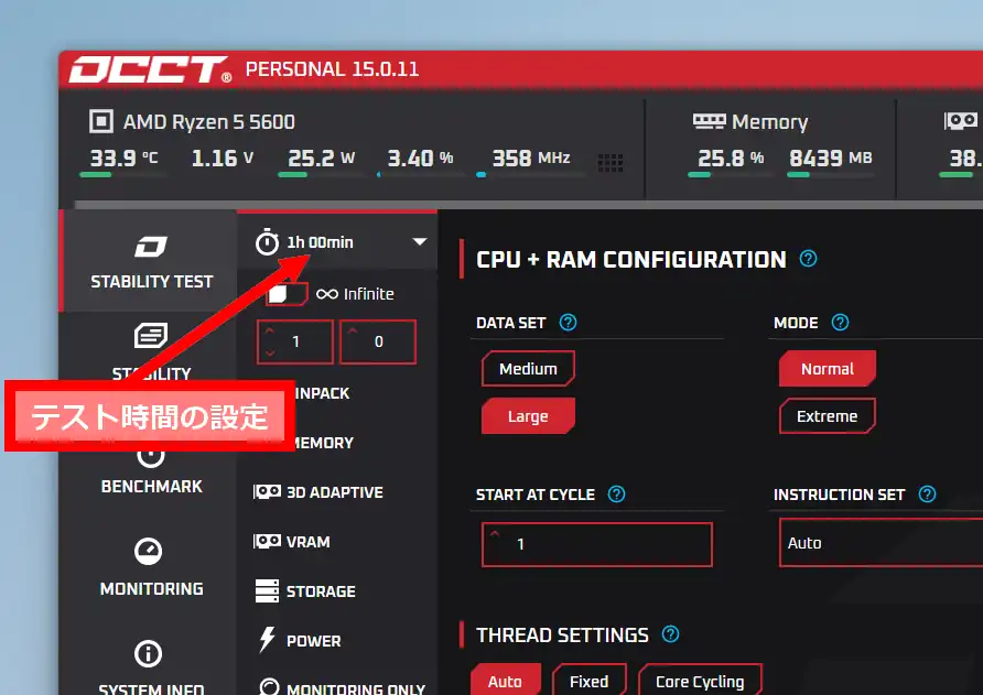 メイン機能であるSTABILITY TEST(安定性テスト)を行う前に、テスト時間を設定出来ます。標準で1時間となっていますが、右側で分単位の指定も可能です。
