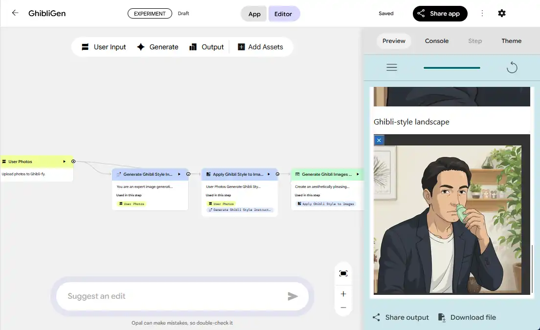 操作画面は現状では英語のみで日本語化されていませんが、日本語入力で問題無くアプリの作成が可能です。最近流行り?の写真をジブリのアニメ風に変換するといったAIを活用したアプリも作成でき、作ったアプリを公開して他者と共有する事も出来ます。