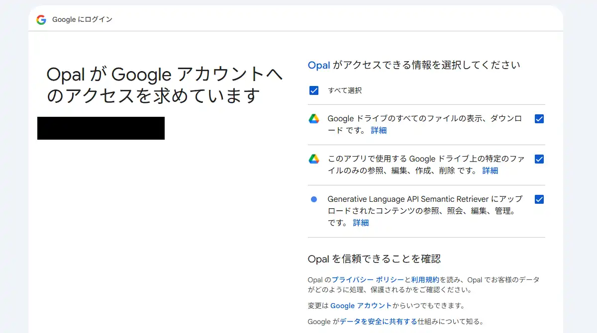 一旦Googleへのログインが必要です。ログイン後、Opalがアクセス出来る情報の選択画面が表示されますが、筆者が確認した所では1つも選択せずに進むとOpalを使う事が出来なかったので結局全てにチェックを入れて下部にある「続行」で進みました。