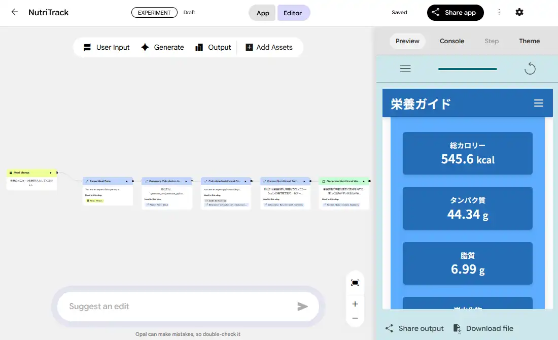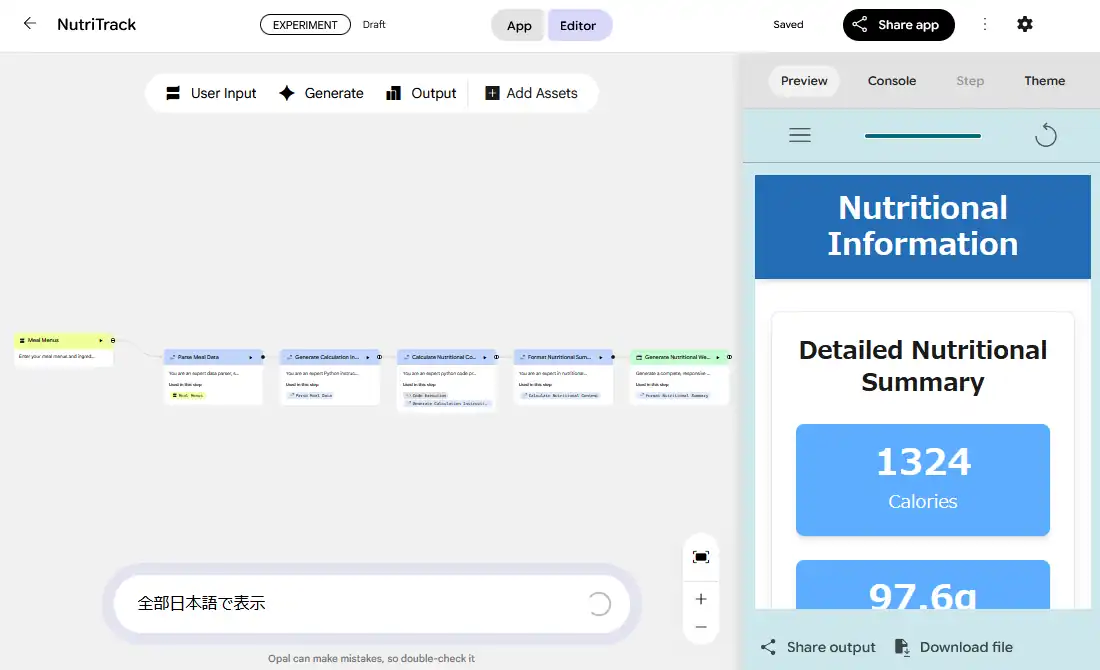 今回は「入力した食事メニューの栄養素の合計を表示」という内容で生成を実行してみました。