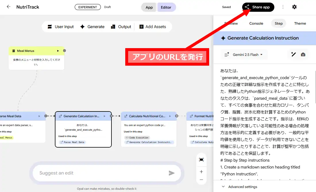 画面上に表示されているカードをクリックしてプロンプトを書き換える事で、もっと思惑通りにアプリを生成させる事が出来るようです。ただプロンプトの部分は独特な表現が使われて記述されているので編集は難しそう。他、上部にある「Share app」ボタンでアプリのURLを発行して、そのURLからアプリを第三者と共有する事が出来ます。