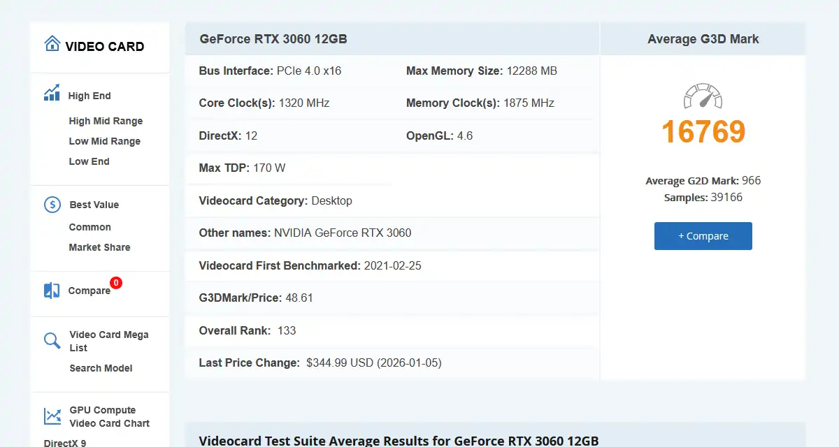 GPUの場合も中央に仕様が表示され右にベンチマークスコアの平均値が掲載されています。目立つように記載されている「Average G3D Mark」は3Dグラフィックスのベンチマークスコアの平均値、その下にある「Average G2D Mark」が2Dグラフィックスのスコアの平均値となります。
