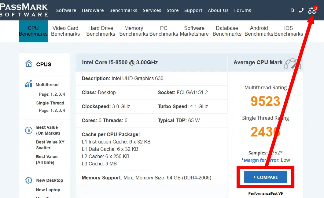 PassMarkでは複数のCPUやGPUの型番を並べて比較しやすいように表示する機能もあります。スコアが表示されている部分の下にある「+COMPARE」ボタンをクリックすると、その型番が比較に追加されます。これを比較対象の型番で繰り返し行っていきます。