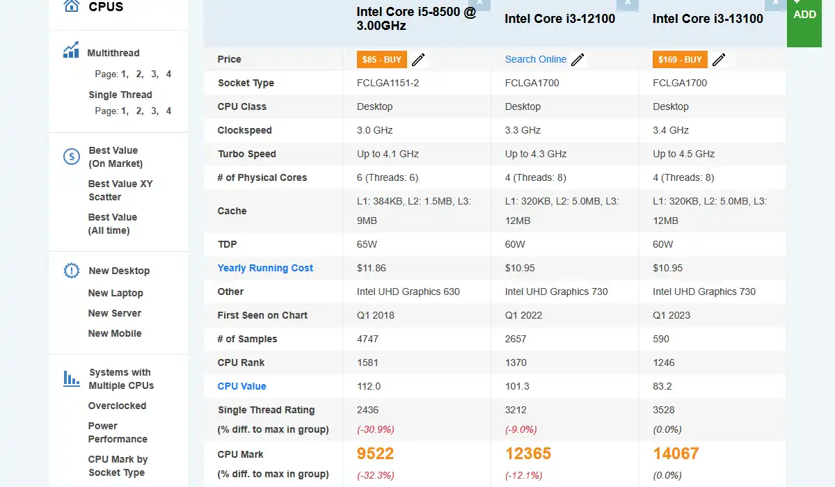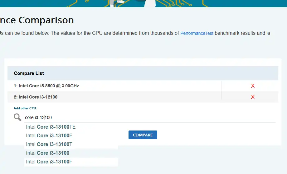 CPU Performance Comparisonのページを直接開いてCPUの型番の入力から追加していくという方法もあります。追加方法は型番の入力で該当するリストが表示されるので、それを選択するだけですが、「i3 12100」のように入力しても一致無しとなり、しっかりハイフンまで入れて「i3-12100」といった具合に正確に入力する必要があります。比較対象のCPUを追加後は「COMPARE」ボタンで同様に一覧で表示されます。勿論CPUだけでなくGPUでもVideo Card Performance Comparisonで同様の事が出来ます。