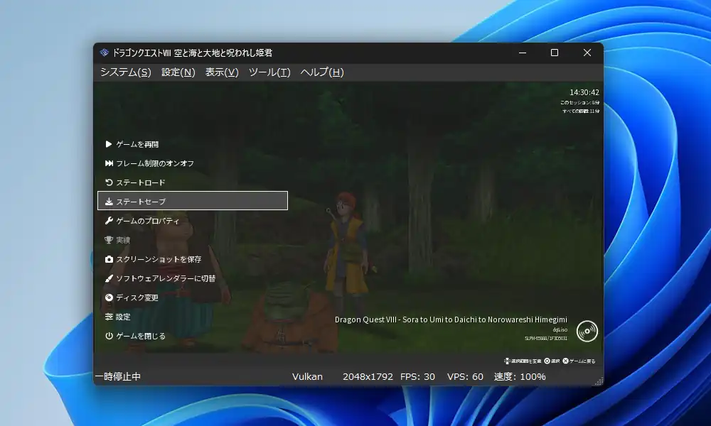ゲーム機エミュレータの多くにはステートセーブ機能があり、PCSX2も例外に漏れずステートセーブ機能を備えています。これは通常のゲーム内のセーブと異なりユーザーが自由なタイミングで現在の状態を保存する事が出来る機能です。PCSX2の場合はメニューの「ファイル」-「ステートを保存」から実行出来ます。他に標準設定のままならEscキーでメニューを出して「ステートセーブ」を選択します。PCSX2のステートセーブ機能はPS3エミュレータのRPCS3と比較するとかなり安定して動作します。