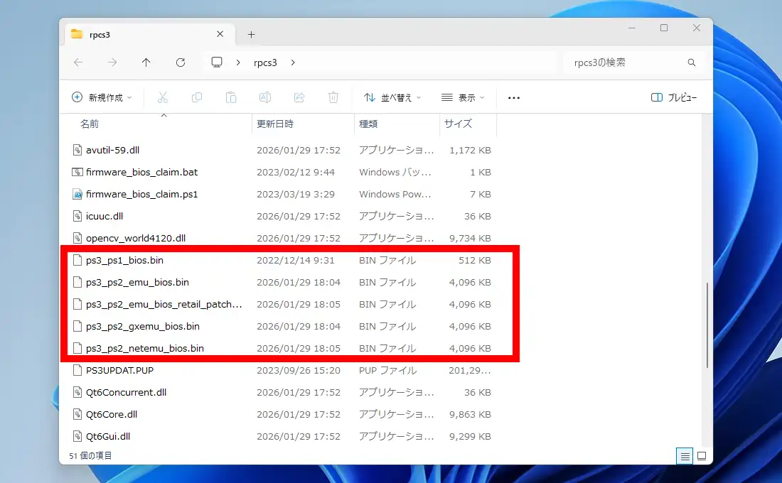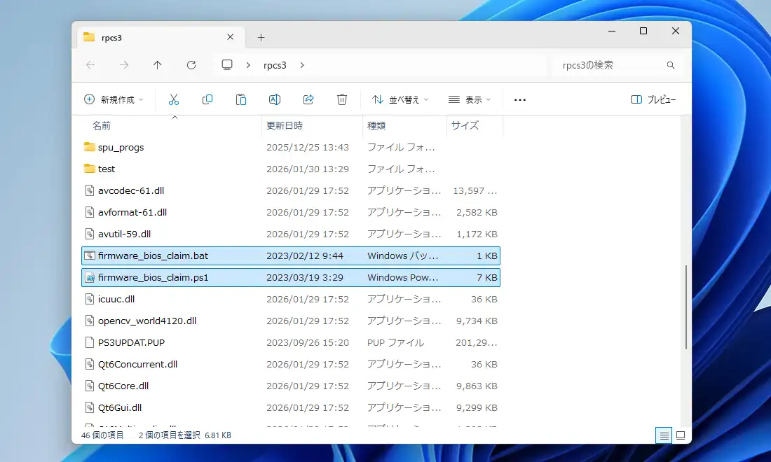 圧縮ファイル展開後、Windows用の「firmware_bios_claim.bat」と「firmware_bios_claim.ps1」をRPCS3のフォルダ内にコピーして配置。