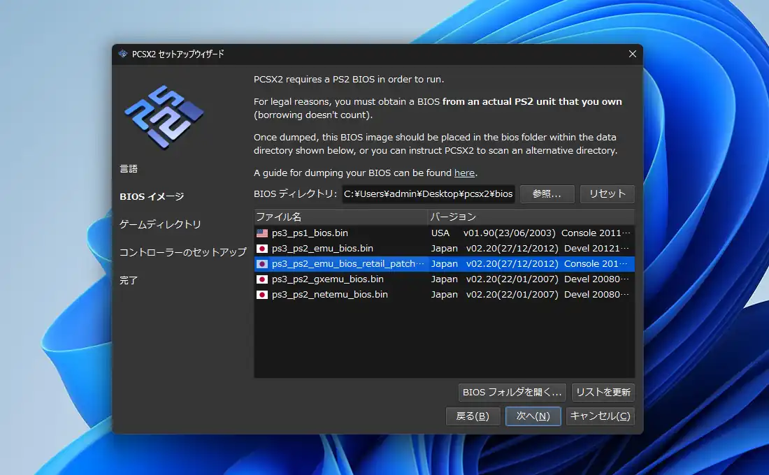 BIOSの指定画面が表示されます。標準では「C:\Users\ユーザ名\Documents\PCSX2\bios」フォルダを読み込むようになっているので、このフォルダ内に保存してあるPS2のBIOSをここで指定します。通常は「ps3_ps2_emu_bios.bin」を選択。筆者は試しに「ps3_ps2_emu_bios_retail_patched.bin」を指定してみましたが、どちらを指定しても問題無く動作したので違いについては分かりませんでした。
