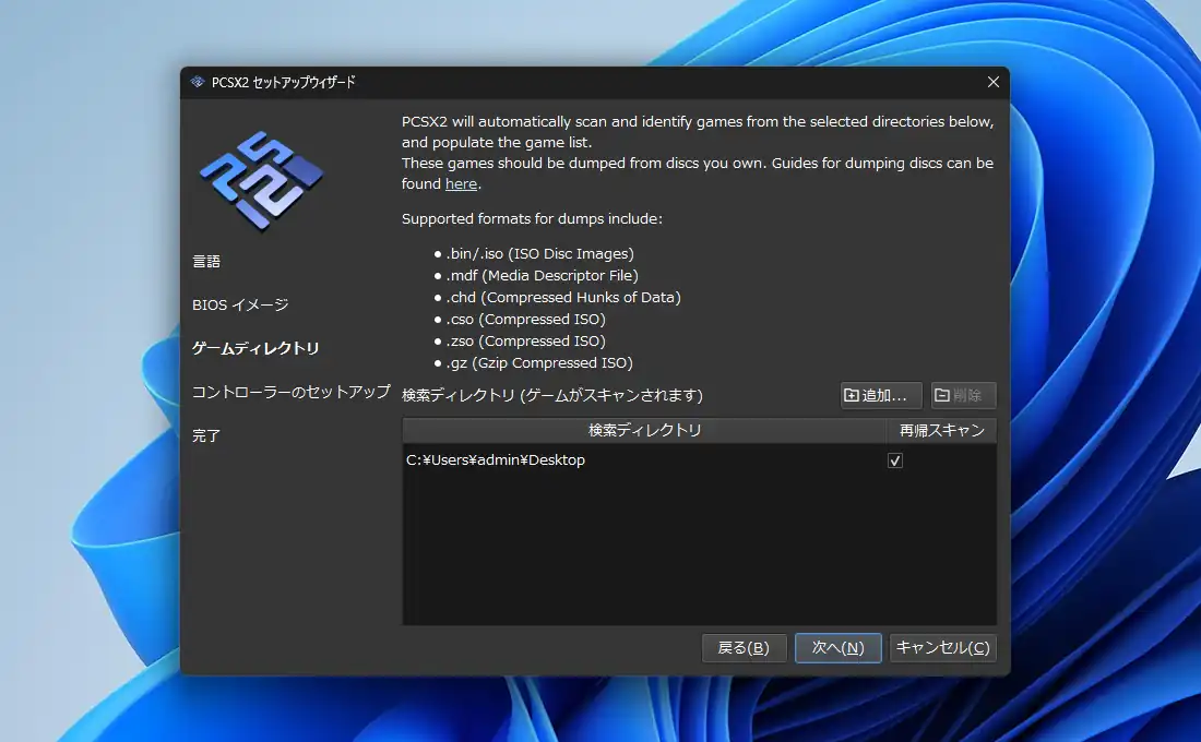 ゲームディスクのファイルの保存先フォルダを指定します。ここで指定されたフォルダをPCSX2がスキャンして読み込むという事になります。後からでも変更出来るので適当で構いません。