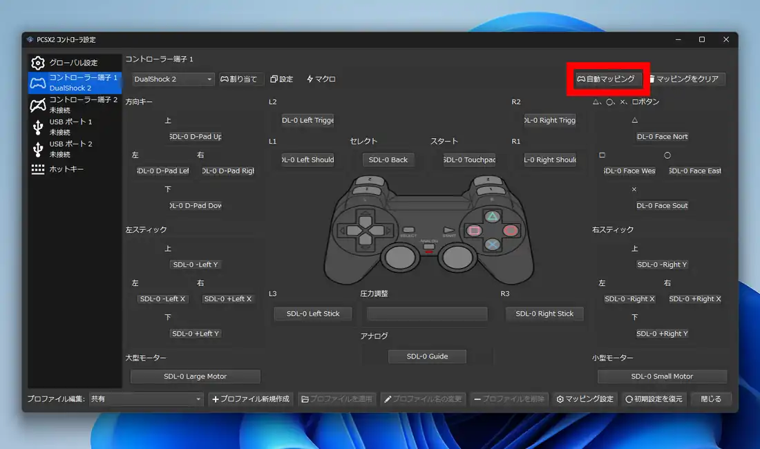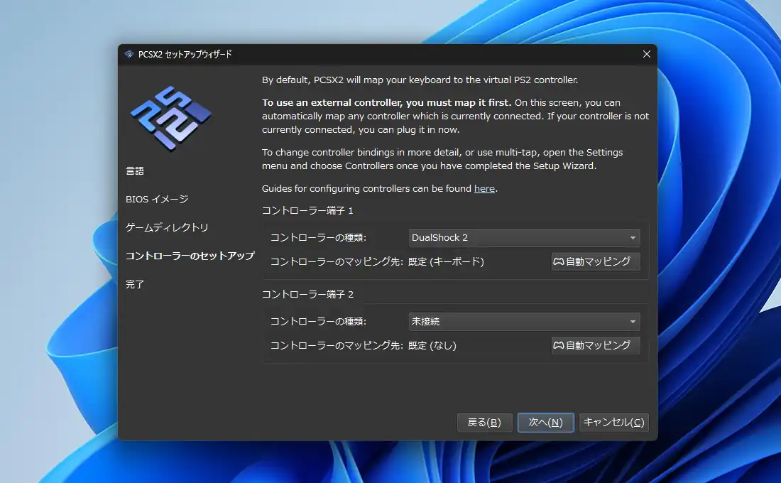 コントローラの簡易設定を行います。但し後から接続しているコントローラに対して、どのボタンをどこに割り当てるかといった詳細な設定が行えるので、無設定のままで問題ありません。