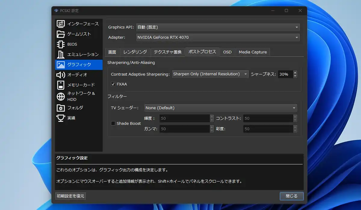 「FXAA」は標準で無効になっていますが、ジャギ(輪郭のギザギザ)を滑らかにする効果があり有効化推奨。「TVシェーダー」は昔のブラウン管風に表示する機能らしく、昔の雰囲気を出したいといった用途を除けば有効化する必要性の無い設定だと思われます。