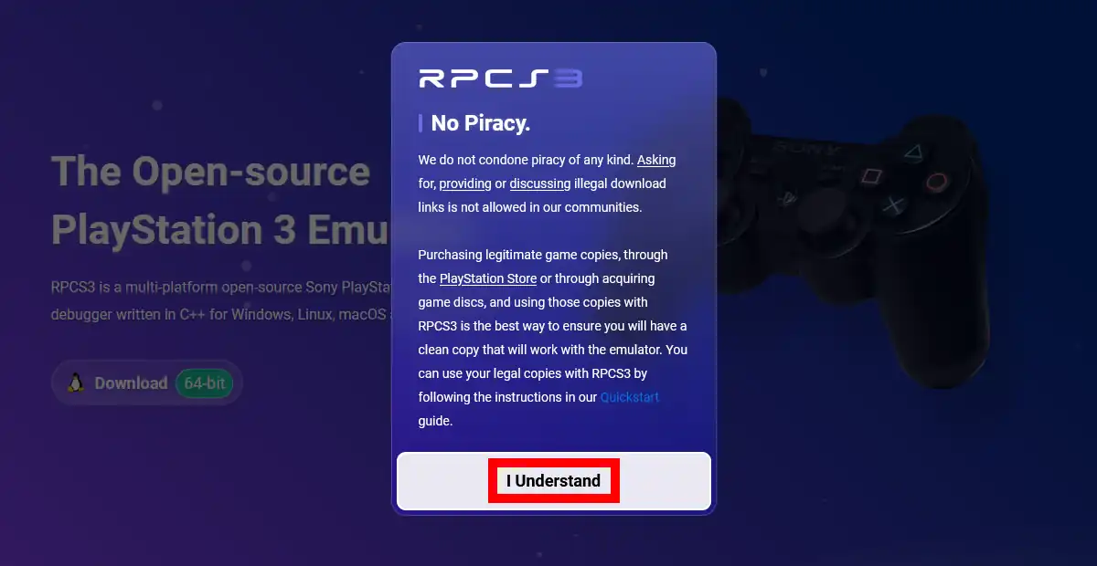 RPCS3公式サイトにアクセスします。最初にNo Piracy.(海賊版の禁止)という画面が表示されます。英文を要約すると海賊版や違法ダウンロードの禁止、正規の方法でRPCS3は使用出来るといった内容となっているので確認後に「I Understand(理解した)」をクリックして、この画面を閉じます。