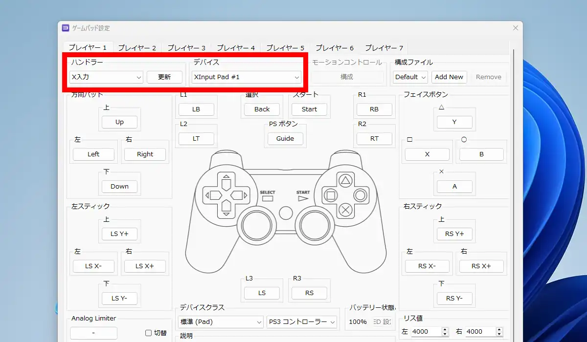 ツールバーにある「パッド」でPCに接続しているコントローラのボタンの割り当てを行います。筆者はDUALSHOCK 4をDS4Windowsを使用して接続しているので「ハンドラー」はX入力、「デバイス」はXInput Padとなりますが、DUALSHOCK 4やDualSenseをDS4Windowsを通さずBluetoothでPCと接続した場合、「ハンドラー」でデュアルショック 4やデュアルセンスを選択して各ボタンを割り当てる事も出来ます。他にキーボードやデュアルショック 3も用意されています。