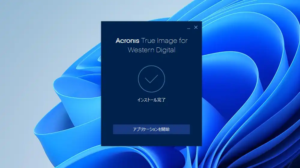 インストールの進捗画面が表示され、終了すると「インストール完了」と表示されるので「アプリケーションを開始」から起動します。