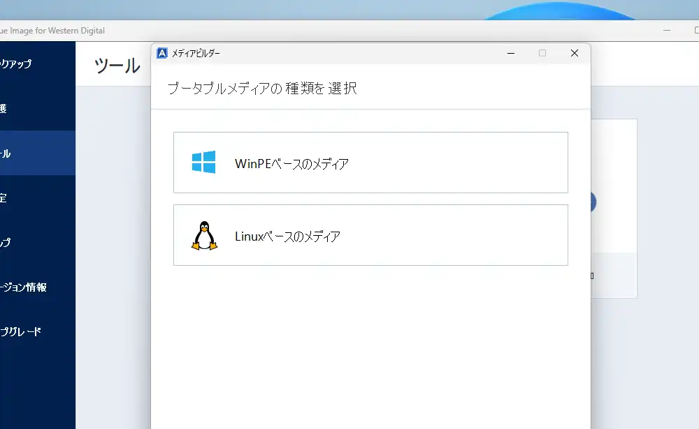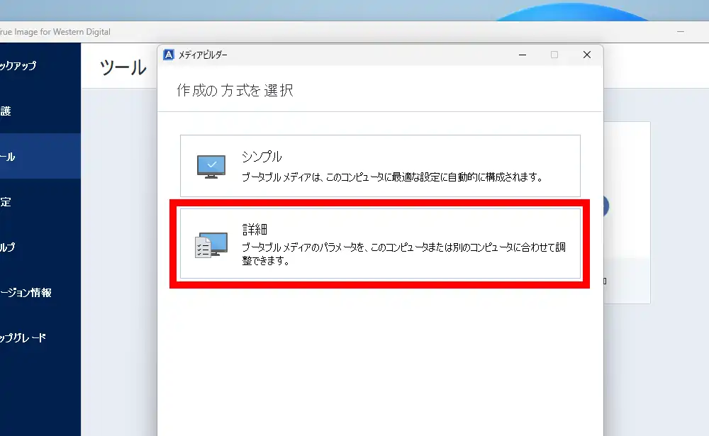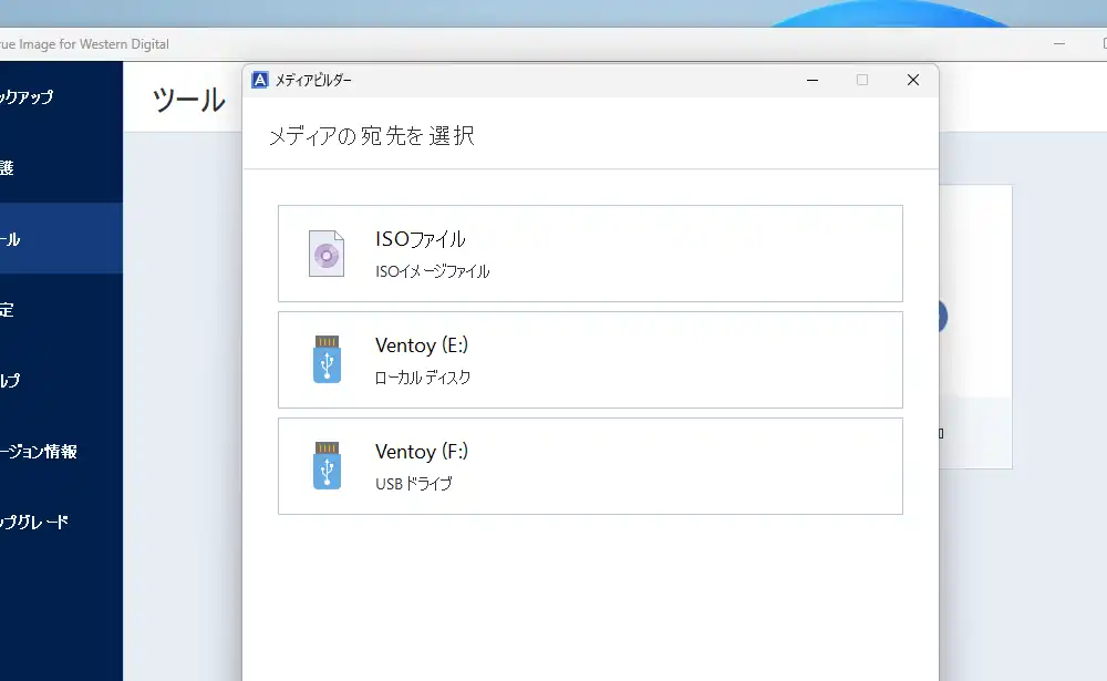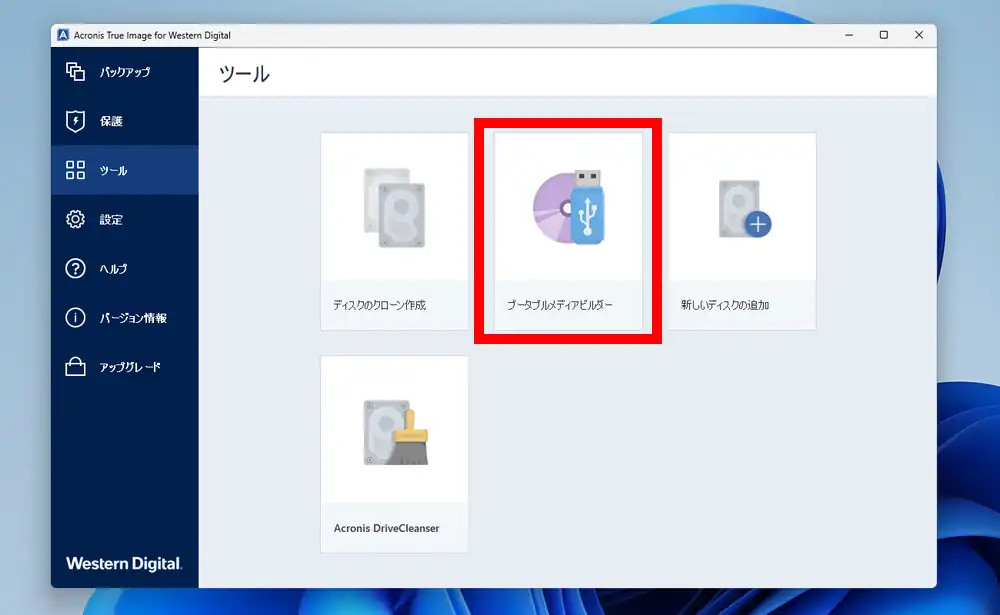 冒頭の方でも書きましたが、この記事ではWindowsにインストールしたTrue Imageを使うのではなく、一旦ブータブルメディアを作成して、そのブータブルメディアのTrue Imageからバックアップや復元操作を行う事を前提としています。そこでまずは左メニューにある「ツール」から「ブータブルメディアビルダー」を起動します。