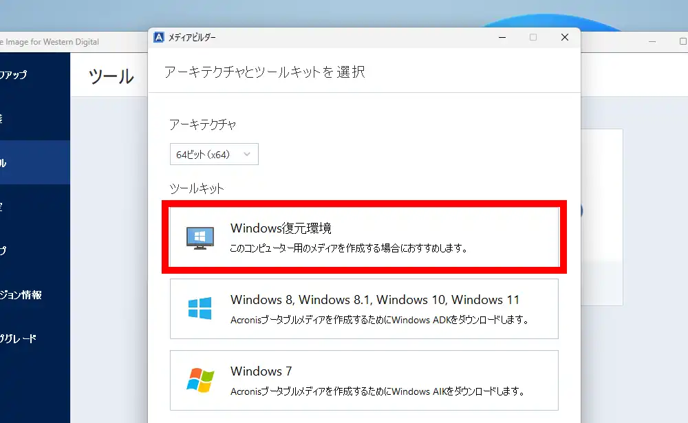 周辺機器との互換性を重視するならWinPEベースの方が優秀です。WinPEベースで作成する場合、現在のOSの復元環境から作成する「Windows復元環境」と、別途Windows ADKをインストールしてから作成する方法、Windows AIKをインストールしてから作成する方法が用意されていますが、圧倒的に簡単で楽なのは「Windows復元環境」からの作成です。ここではこれを選択して進めます。