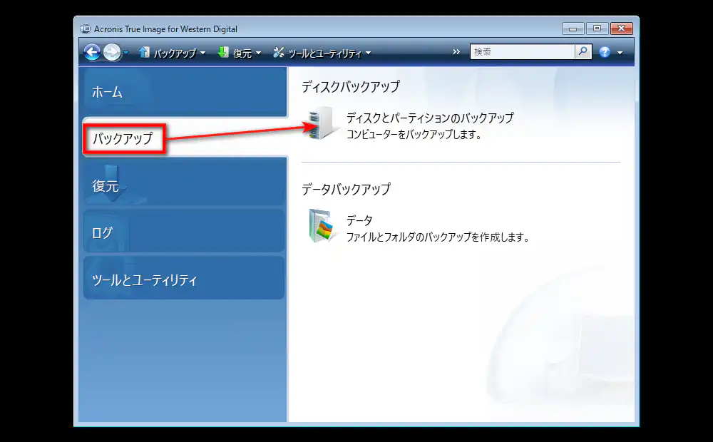 WinPEベースの場合、最初にコマンドプロンプトが起動しますが、これを閉じてしまうと終了してしまうのでTrue Imageが起動するまで放置して、起動後は最小化しておきます。True Image起動後、左メニューの「バックアップ」から「ディスクとパーティションのバックアップ」へと進みます。