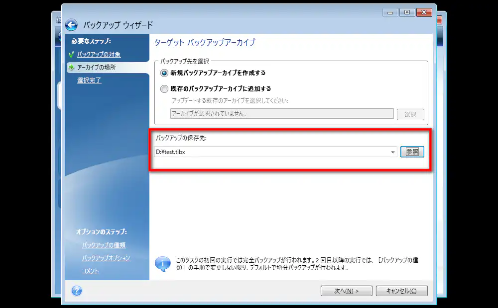 バックアップの作成方法と保存先を選択します。初めてバックアップを行う場合は「新規バックアップ」になりますが、2度目の場合は既存のバックアップファイルを元に増分バックアップを行う事も出来ます。後は「参照」ボタンから保存先を選択してファイル名を付けておきます。