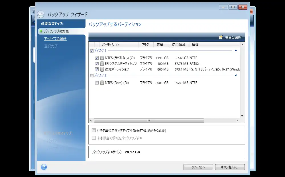 バックアップ対象のディスク、もしくはパーティションを選択します。下部にある「セクタ単位でバックアップする」はディスクの未使用領域も含めてセクタをそのまま保存しますが、バックアップファイルの容量が大きくなり殆どの場合は無駄なので、特別な理由がない限りは使用しません。