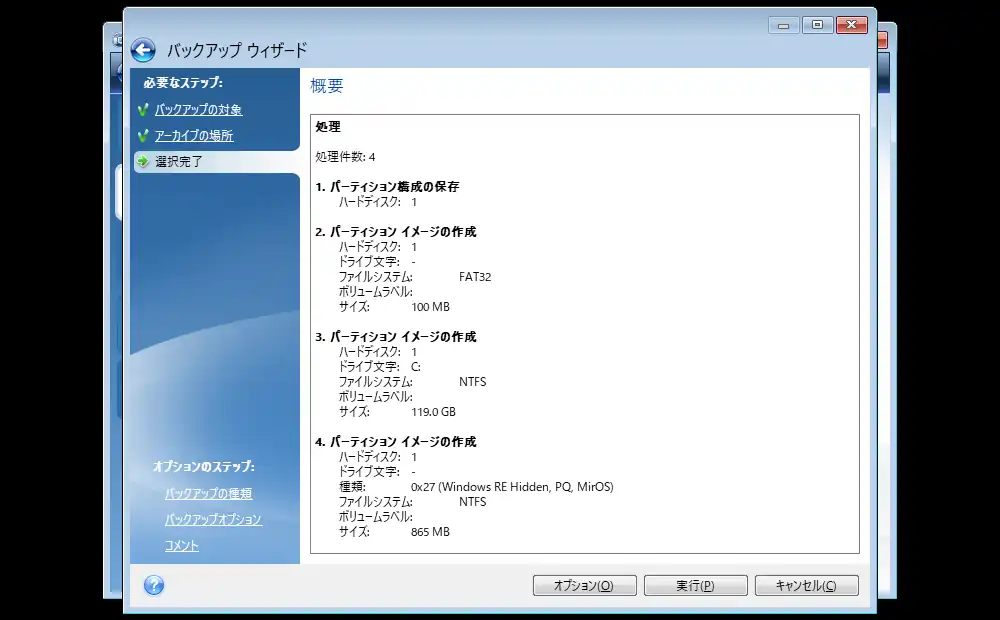 「概要」画面が表示されます。間違いが無いか確認後、「実行」でバックアップを開始します。進捗画面表示後に一時的に硬直したようになりますが、放置しておけばバックアップが進行する筈です。最後に「バックアップ処理が成功しました」と表示されれば完了です。