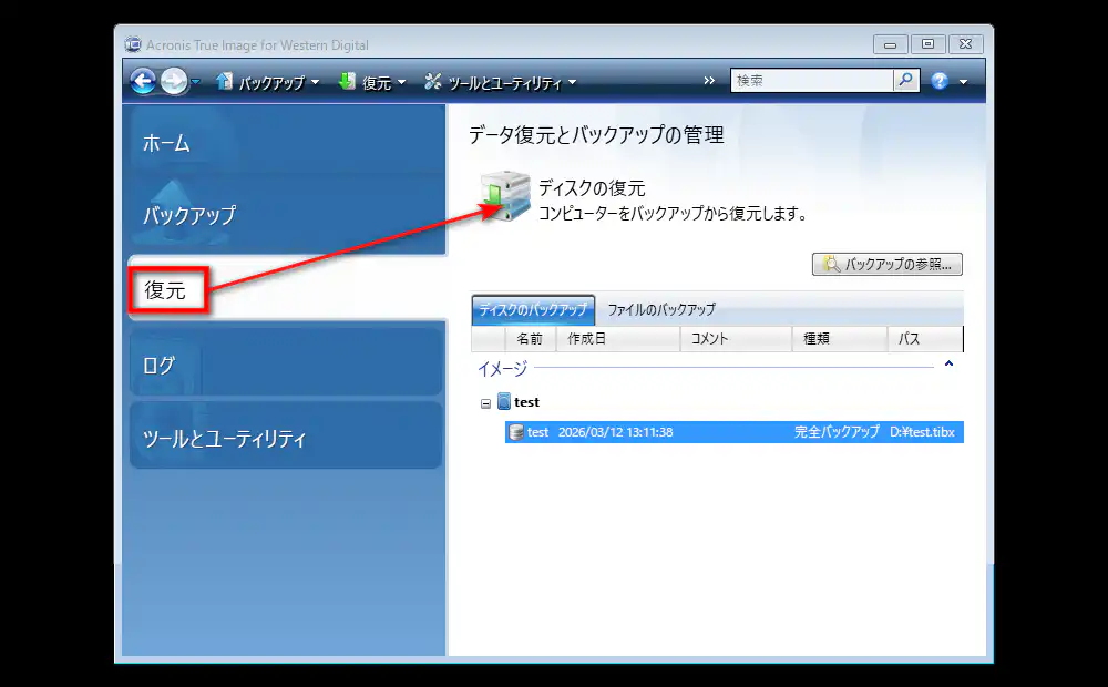 何らかのトラブルがあった場合や以前の状態に戻したくなった場合、作成したバックアップを元に復元を行います。左メニューの「復元」から「ディスクの復元」へと進みます。