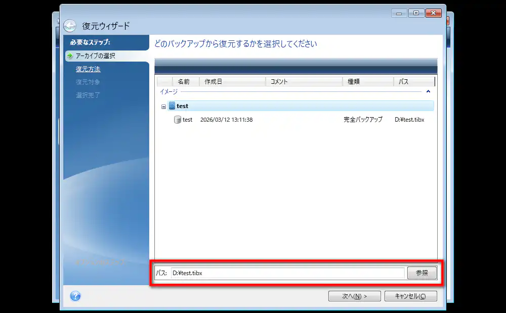 バックアップの選択画面では既に作成しておいたバックアップが選択された状態になっているかもしれませんが、複数のバックアップがある場合は下部の「参照」ボタンからバックアップ元を選択出来ます。