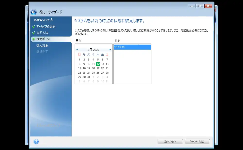 「復元方法の選択」で「ディスクまたはパーティション全体を復元する」から進み、システムを復元する時点の選択となります。ここでは単純にバックアップを作成した日時の選択となります。