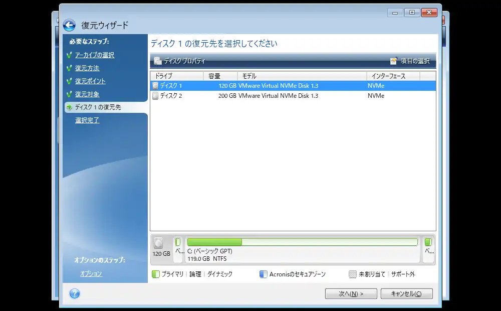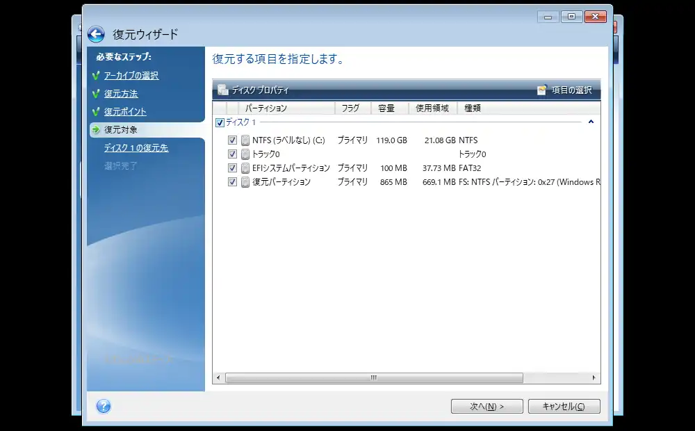 復元対象の選択画面となります。ディスク全体のバックアップから特定のパーティションのみ復元するといった事も出来ます。