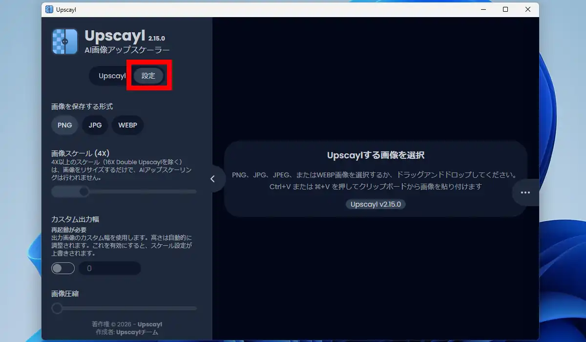 実際に変換する前に画面左上にある「設定」から一通り設定を見ていきます。設定内には初期設定で行った言語やテーマの指定もありますが、スクロールすると標準での保存形式の指定や「画像スケール」から標準の拡大率を指定出来ます。その下にある「カスタム出力幅」は出力画像の横幅をピクセル単位で指定する機能で、この部分を有効化すると拡大率の指定は無効化されます。