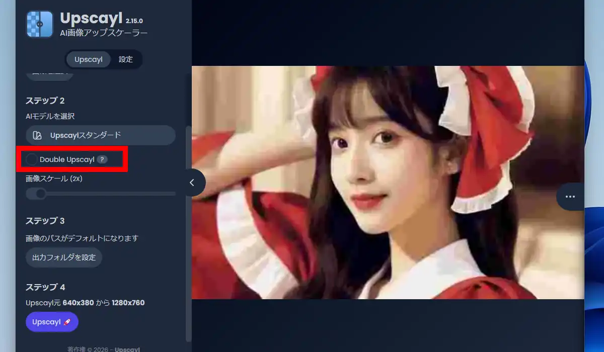 同じくステップ2にある「画像スケール」で倍率の指定を行いますが、「Double Upscayl」と言う機能もあります。これを使うと2倍で出力した場合、再度2倍にアップスケールされ結果4倍となります。直接4倍で処理するのとは異なり、ディテールがより強調されやすくなりますが、過剰気味になり人工的質感になる場合もあります。